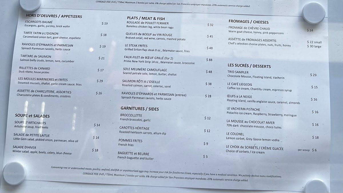As you savor each bite, don’t forget to pair your meal with exquisite dessert wines like Chateau Coutet Barsac or Sandeman Tawny Port, both at $20. The Pommes Frites ($9) and Demi Baguette Et Beurre ($6) are perfect accompaniments, adding an authentic touch to your dining experience.